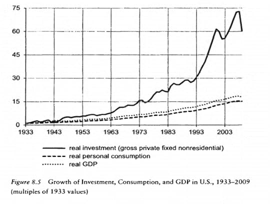 Indeed, when you think about it, the reproduction schema show the very nature of economic growth namely, using more of the value produced in the previous period to invest in extra means of production and labour to increase total value in the new period. That’s the logic of the schema and empirically it’s the reality. Kliman provides evidence that in the US, investment demand was 72 times as large as in 1933, while GDP was only 18 times as large and personal consumption demand was only 15 times as large (see graph below).
