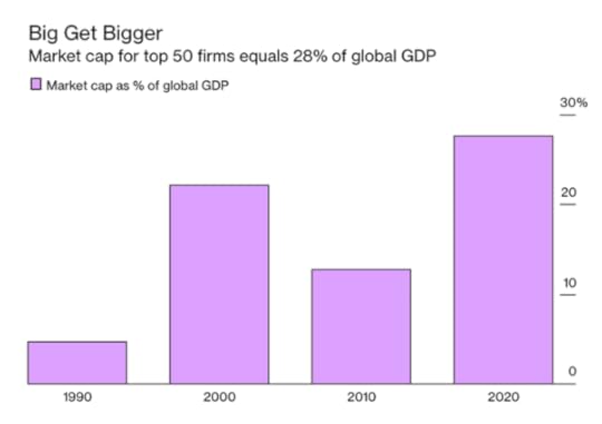 Similarly, a Brookings Institution study found that the top 50 companies globally by value added $4.5 trillion of stock market capitalization in 2020, taking their combined worth to about 28% of global gross domestic product. Three decades ago, the equivalent figure was less than 5%.