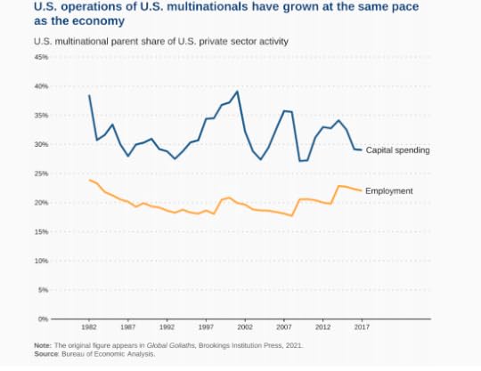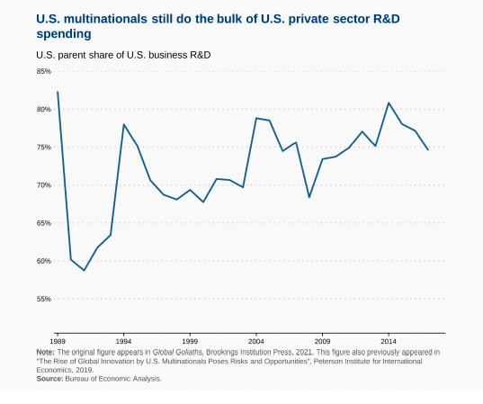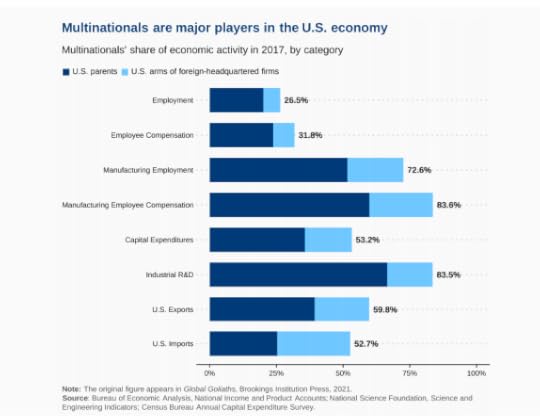 The Brookings Institution found that multinationals are major contributors to the US economy. US-headquartered MNCs accounted for 20.1 percent of all US private sector employment in 2017 and foreign-headquartered firms accounted for another 6.4 percent. Multinationals play a particularly large role in manufacturing: more than 70% of all US manufacturing employment is in MNCs. Multinational firms accounted for more than half of all non-residential capital expenditures in 2017 and more than 80 percent of all industrial R&D done in the US. And multinationals account for more than half of US exports and imports of goods and services.