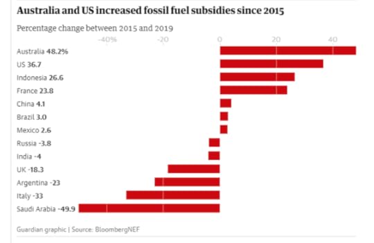 But Australia increased its fossil fuel subsidies by 48% over the period, Canada’s support rose by 40% and that from the US by 37%. The UK’s subsidies fell by 18% over that time but still stood at $17bn in 2019, according to the report. The biggest subsidies came from China, Saudi Arabia, Russia and India, which together accounted for about half of all the subsidies.