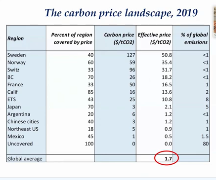 The report also examined how G20 countries were putting a price on carbon pollution. It found that more than 80% of emissions were covered by such prices in France, Germany and South Africa. In the UK, 31% of emissions are covered but the UK has one of highest carbon prices at $58 per tonne of CO2. Just 8% of US emissions are covered and at the low price of $6 per tonne. Russia, Brazil, and India do not have any carbon prices. In his address to the G20, Nordhaus showed that the current average global carbon price is under $2 and 80% of global emissions have no carbon emissions pricing market at all!