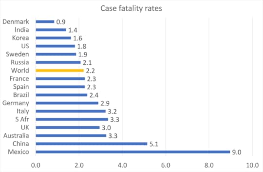 The case fatality ratio is different from the infection fatality ratio (IFR). If we make a reasonable assumption that around 15-20% of the world’s population have been infected, then we find that the IFR is about 0.44%, with many countries in Europe having much higher rates. For example, France at 0.67%; the UK at 0.59%; Italy at 0.65%; Germany at 0.58%. The US IFR is below the world average at 0.36%. These are my estimates and subject to debate as nobody really knows the IFR. Micro studies in various parts of the world over the last year suggest that the IFR is probably between 0.5-0.7%.