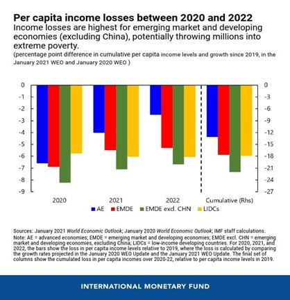 IMF chief Georgieva reports that by the end of 2022, cumulative per capita income will be 13 percent below pre-crisis projections in advanced economies—compared with 18 percent for low-income countries and 22 percent for emerging and developing countries excluding China. “Put another way, the convergence between countries can no longer be taken for granted. Before the crisis, we forecast that income gaps between advanced economies and 110 emerging and developing countries would narrow over 2020–22. ..But we now estimate that only 52 economies will be catching up during that period, while 58 are set to fall behind. ..There is a major risk that most developing countries will languish for years to come.”