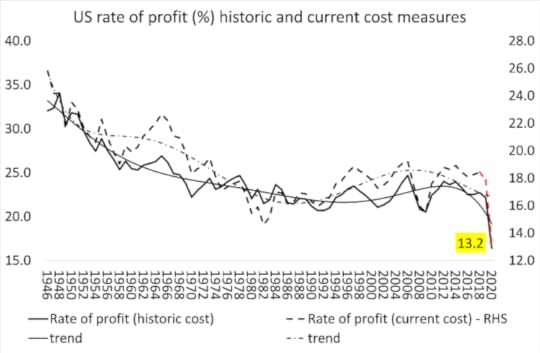 I have identified two factors likely to weaken the ability of the so-called Keynesian fiscal ‘multiplier’ to work sufficiently to boost and sustain economic recovery to new heights. The first is profitability. In a capitalist economy, the business sector rules and business investment dominates. And business investment will not be stimulated by fiscal handouts unless the profitability of capital rises sufficiently. In the year of the pandemic, the profitability of capital in the major economies hit an all-time low. This is the average profitability of the whole sector. Yes, the tiny group of tech companies, the FAANGS, have never had it so good. But their huge rise in profits is not matched in the rest of the business sector.