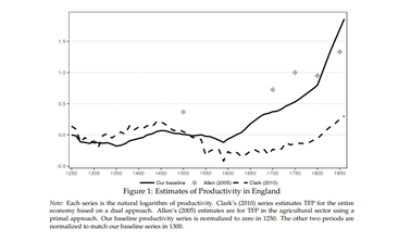 That general view has been vindicated many times in studies of the economic and political history of human organisation. That is particularly the case in explaining the rise of capitalism to become the dominant mode of production. Now there is new study that adds yet more support for the materialist conception of history. Three scholars at Berkeley and Columbia Universities have published a paper, When Did Growth Begin? New Estimates of Productivity Growth in England from 1250 to 1870. https://eml.berkeley.edu/~jsteinsson/papers/malthus.pdf
