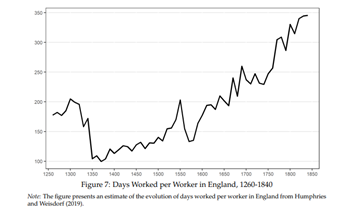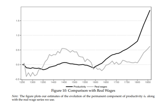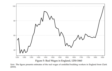 The authors note that before 1600, there is evidence to support the Malthusian case. The period from 1300 to 1450 was a period of frequent plagues — the most famous being the Black Death of 1348. Over this period, the population of England fell by a factor of two resulting in a sharp drop in labour supply. Over this same period, real wages rose substantially. Then from 1450 to 1600, the population (and labour supply) recovered and real wages fell. In 1630, the English economy was back to almost exactly the same point it was at in 1300.