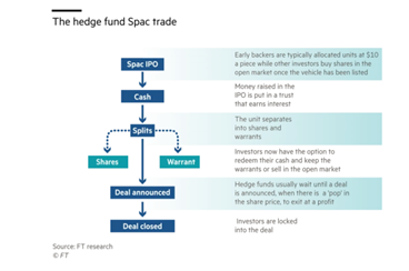 SPACs have taken Wall Street by storm and become a favourite investment among hedge fund managers. As one SPAC explained, we have an “inherently investor-friendly structure” with little downside. In the US, which accounts for the bulk of SPAC activity, 235 vehicles have raised $72bn so far this year, according to Refinitiv. But is there ‘little downside’? Supposedly there is little risk of losing the original investment because cash is put into a trust that invests in US treasuries and shareholders can ask for their money back at any point. But there is a potential to make lofty returns come from a unique quirk in the SPAC, which splits into shares and ‘warrants’ (options to buy shares) shortly after the structure starts trading. And here there is substantial risk that things will go wrong.