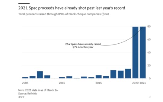 First, there are SPACS, Special Purpose Acquisition Vehicles. These are so-called “blank cheque” companies e. banks and other hedge funds invest in a SPAC, which owns nothing, but promises investors that the SPAC will buy a privately-owned company, then take it to the stock market in what is called an Initial Public Offering (selling shares to the public). If the IPO leads to higher price than the investment in the SPAC, everybody makes a profit.