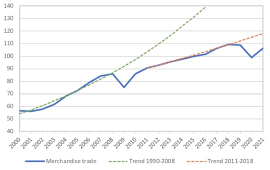 The impact on world trade has been even more damaging. According to the World Trade Organisation, world trade growth will never return to its previous trajectory.