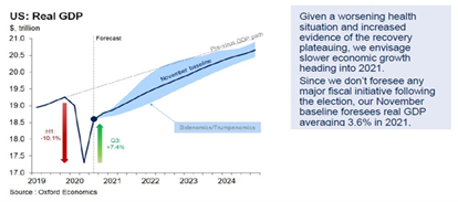 So there will be no V-shaped recovery as was hoped – indeed of the major economies globally, only China is achieving that. Instead, there is what I have called a ‘reverse square root’ recovery where output falls but then does not recover to the same trajectory of economic growth that was there before. That output is lost forever, as the forecast for the US from Oxford Economics below shows.