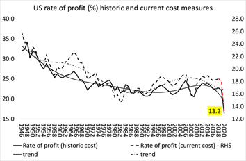 The problem is that the capitalist sector of the US economy is very reluctant to invest and the principal reason is that the profitability of such investment is so low. Indeed, the rate of profit of US capital is at a post-1945 low.