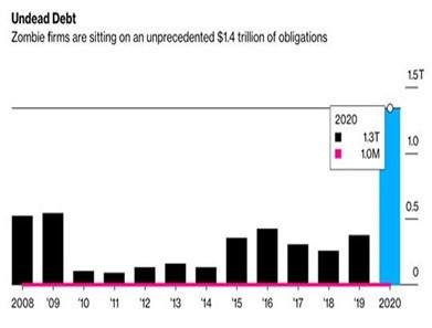 Most companies lost money in 2020. And there is a swathe of businesses, mostly outside the top 500, but not entirely, which are in deep trouble. Earnings are low or negative and even with the cost of borrowing near zero, these ‘zombie’ companies are not earning enough to cover even the interest on existing and new loans. These ‘financially challenged’ zombies constitute about 20% of companies in most economies.