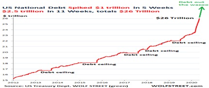Sure, we hear all about the huge profits made by the likes of Amazon, Google, Netflix and the big banks during the 2020 pandemic slump, but the profits of the FAANGS are the exception to the rule. Total corporate profits (after government handouts are removed) have dropped by some 30%. And according to Bloomberg, in the US, almost 200 big corporations have joined the ranks of so-called ‘zombie’ firms since the onset of the pandemic. They now account for 20% of the top 3000 largest publicly-traded companies, with debts of $1.36 trillion. That means 527 of the 3000 companies didn’t earn enough to meet their interest payments! So there remains a significant risk of a credit crunch and financial crash down the road, perhaps in 2021, when the Fed largesse is curtailed.