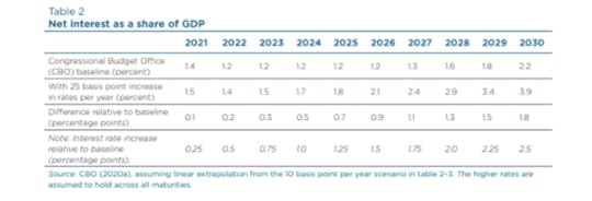 There is no doubt that net interest on government debt is very low historically, only slightly more than 1% of GDP a year compared to a GDP growth rate of 2-3% a year ahead. But some mainstream studies are less sanguine. The Peterson Institute argues that those “who believe that rates will almost certainly not rise are too confident in their own views. The forces that have contributed to lower rates are universally difficult to predict, and, as noted above, even modest changes in rates can produce sizable movements in net interest as a share of the economy in the future.” Fiscal resiliency in a deeply uncertain world: The role of semiautonomous discretion | PIIE