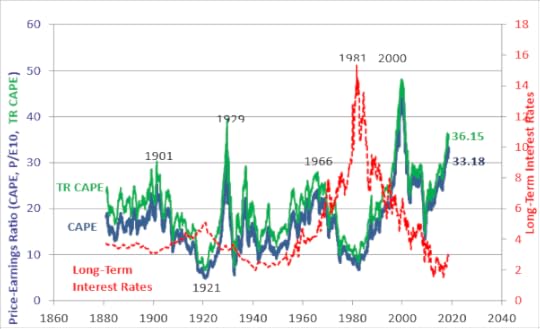 You can see from this (CAPE Shiller) graph below that, as long term interest rates have fallen, the market cap price of corporate shares relative to profits (earnings) has risen. Currently, it is at levels only surpassed in 1929 and during the dot.com boom of 2000.