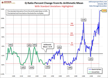 For the last 100 years or so, the average mean Q Ratio is about 0.78. The Q ratio high was at a peak of the tech bubble in 2000 reaching 2.17 — or 174% above the historic average. The lows were in the slumps of 1921, 1932 and 1982 at around 0.28, or 62% below average. But in this year of the COVID, Tobin’s Q has reached 233% above the mean – a new record.
