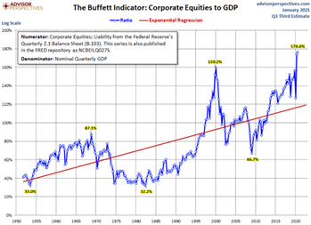 Another useful measure of the value of the stock market relative to the real economy is the Buffett index. Named after famed billionaire financial investor who uses this index as his guide, it measures the money value of all stocks and shares against the current national output in the real economy (GDP). Again, this shows that in the year of the COVID, the stock market has reached record high relative to the ‘real economy’.
