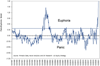 Citi Research has a “Euphoria/Panic” index that combines a bunch of market mood indicators. Since 1987, the market has typically topped out when this index approached the Euphoria line. The two exceptions were in the turn-of-the-century technology boom, when it spent about three years in the euphoric zone, and right now.