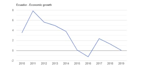 Between 2006 and 2014, under Correa, GDP growth had averaged 4.3%, driven by high oil prices and foreign investment. So Correa was able to raise minimum wages and social security benefits significantly, partly financed by higher taxes on the rich. But from 2015, GDP growth averaged just 0.6%.