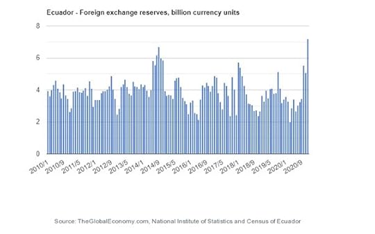 And there are big obstacles to recovery. The government cannot devalue the currency to make exports cheaper because Ecuador has no national currency. It is a dollar economy. That means if the central bank is to fund government spending by buying government bonds or crediting government accounts, because the government does not control the unit of account, dollar reserves will have to be run down, although there is some room here as FX reserves are at a record high as the dollar has weakened. And Arauz plans to obtain loans from China to replace IMF funding.