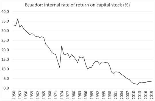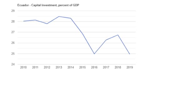 That’s partly because of the drop in energy prices but also because it seems that investing for profit in Ecuador is not promising. Energy and resources industries are highly capital-intensive, so in Marxist terms, the organic composition of capital rises significantly over time. This drives down the profitability of future investment, which has especially been the case in Ecuador since the so-called emerging market crisis of 1998. Only slowing down investment since 2014 has stopped profitability falling further.