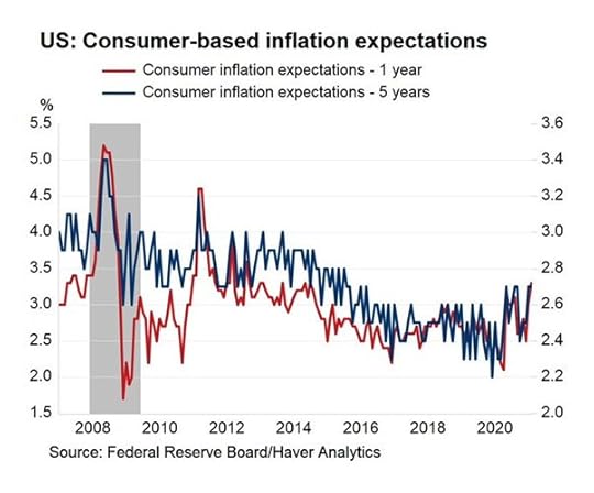 It’s true as Dudley says that ‘inflation expectations’ are rising and that can be a good indicator of future inflation – if households think prices are going to rise, they tend to start spending in advance and so stimulate price rises – and vice versa. And it’s also true that, given the sharp fall in price inflation at the start of the pandemic lockdowns last year, any recovery in prices now will show up as a statistical year on year rise. But as you can see from this graph below inflation expectations are hardly at a level of “of a kind we have not seen in a generation” (Summers).