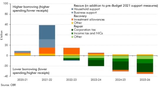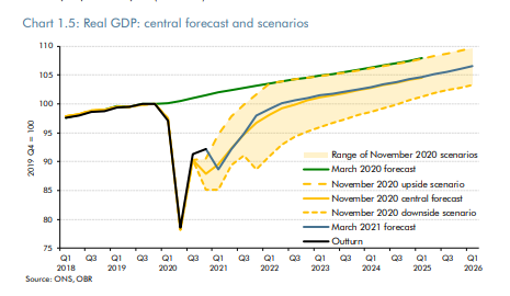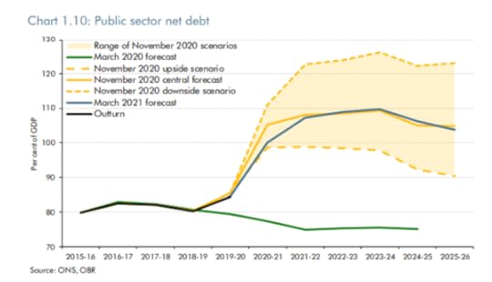 The COVID pandemic forced the government to spend unprecedented amounts for rescue support to households, businesses and public services to a total cost £344 billion. Huge budget deficits will emerge right through this parliament and public sector debt will go over 100% of GDP and remain above that level throughout to 2025.