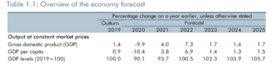 Longer term, the official forecast for average real GDP growth is just 1.7% a year, or some one-third below pre-2019 growth rates. That suggests a significant impact from ‘scarring’ to employment and investment capacity from COVID and from the loss of trade from Brexit.