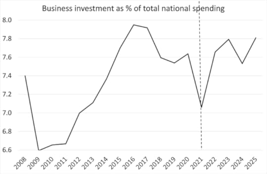 My calculations from the official forecast suggests that business investment will rise to about 7.8% of total national spending by 2025 from the COVID slump of 7.1%. But even in 2025, that investment rate will be below 2016 levels and only 5% above 2007 – after 18 years!