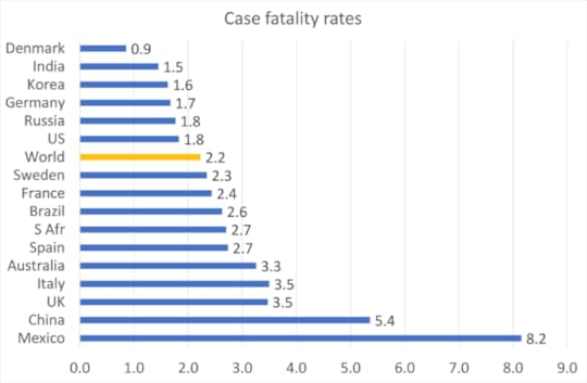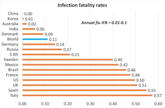 The IFRs in most of the major countries are about 0.4-0.6%, more or less as forecast by various sample studies. And my estimate of 18% infected globally may well be too high. If I lowered the global infection rate to 15%, then the IFRs would be in the 0.6-0.7% range. That compares with the annual flu IFR of less than 0.1%. So for these hard-hit countries, COVID-19 is at least five times more deadly than annual flu. And, of course, we are now finding out that there is often long-lasting damage to human organs from COVID, unlike flu.