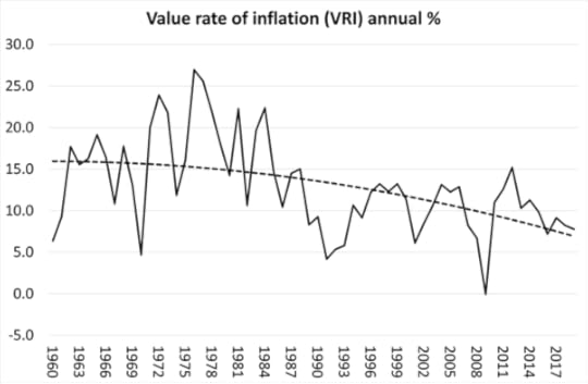 Total value will decline relatively to use value production and new value will decline relatively to total value. So there is an underlying deflationary or disinflationary pressure on the prices of commodities over the long term. But there are counteracting factors that can exert an upward pressure on prices over the long term; in particular, the intervention of the monetary authorities with their attempts to control the supply of money.