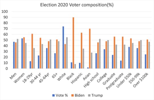 My analysis found that there was a very high voter turnout in comparison with other post-1945 elections, but non-voters still took the largest share of those eligible to vote beating both Biden and Trump. White male working class voters went for Trump by over two to one, but the working class as a whole showed a small majority (2.5%) for Biden because younger Americans voted for Biden sufficiently to overcome Trump majorities among older voters; working class women and ethnic minorities voted for him in sufficient numbers to overcome the votes of white males, small town business people and rural areas. They voted to get rid of Trump: but they may not expect much from Biden and they will be right.