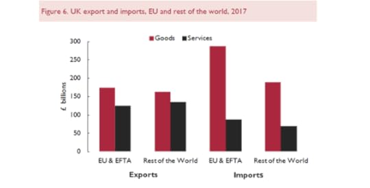 Indeed, while the UK runs a huge goods trade deficit with the EU, that is in part compensated by running a surplus in services trade with the EU. This surplus is in mainly financial and professional services where the City of London leads. Exports of UK financial services are worth £60 billion annually compared to imports of £15 billion. And 43% of financial services exports go to the EU.