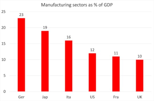 The UK is a country of bankers, lawyers, accountants and media people, rather than engineers, builders and manufacturers. The UK has a huge top-heavy banking sector, but a small manufacturing sector compared to other G7 economies.