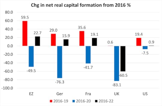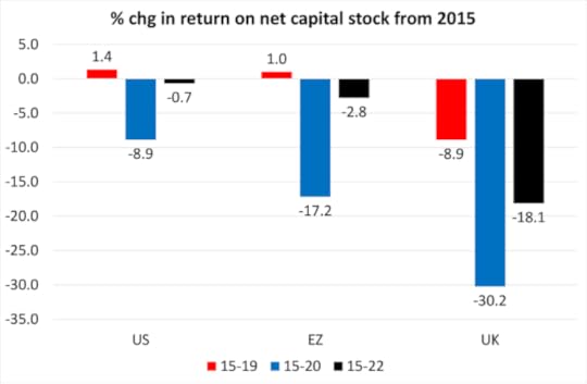 Since the referendum of 2016, UK profitability has fallen by nearly 9%, compared to small rises in the Eurozone and the US. And the Eurozone AMECO forecast for profitability will leave the UK 18% below 2015 levels by 2022!