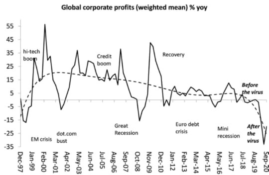 The pandemic global slump of 2020 is different from previous slumps in capitalism. The boom and slump cycle in capitalist production and investment is often triggered by a financial crash, either in the banking system (as in the Great Recession of 2008-9) or in the ‘fictitious capital’ world of stocks and bonds (as in 1929 or 2001). Of course, the underlying cause of regular and recurring slumps lies in the movements in the profitability of capital, as has been discussed ad nauseam in this blog. This is the ‘ultimate’ cause. But ‘proximate’ causes can differ. And they are not always ‘financial’ in origin. The first simultaneous international post-war global slump of 1974-5 was triggered by a sharp rise in oil prices following the Arab-Israeli war; and the double-dip recession of 1980-2 had similar origins. Again, the 1991-2 recession followed the ‘Gulf War’ of 1990.