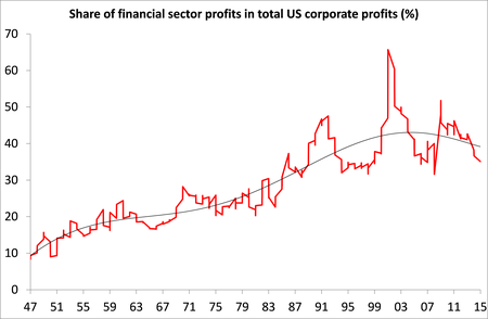 It appears there was significant rise in the rate of profit in the early 2000s to a peak in 2006, after which there was fall through to the Great Recession of 2008-9. The 2006 peak was higher than the peak of 1997. How can we explain this? Well, in the period after the end of the mild recession of 2001 there was a massive credit-fuelled boom that led to profits in the financial sector reaching a record share of around 40% of total profits by 2006.