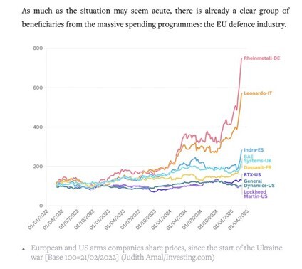 So nearly everywhere in Europe, the call is for increased ‘defence’ spending and rearmament. European Commission President Ursula von der Leyen has proposed a Rearm Europe Plan which aims to mobilise up to €800 billion to finance a massive ramp-up in defence spending. “We are in an era of re-armament, and Europe is ready to massively boost its defence spending, both to respond to the short-term urgency to act and to support Ukraine, but also to address the long-term need to take on more responsibility for our own European security,” she said. Under an ’emergency escape clause’, the EU Commission will call for increased spending on arms even if it breaks existing fiscal rules. Unused COVID funds (E90bn) and more borrowing through a “new instrument” will follow, to provide €150 billion in loans to member states to finance joint defence investments in pan-European capabilities including air and missile defence, artillery systems, missiles and ammunition, drones and anti-drone systems. Von der Leyen claimed that if EU countries increase their defence spending by 1.5% of GDP on average, €650 billion could be freed up over the coming four years. But there would be no extra funding for investment, infrastructure projects or public services, because Europe must devote its resources for preparing for war.