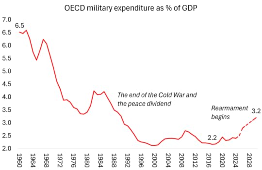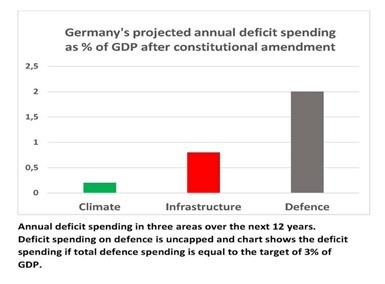 Over in Germany, the Chancellor-elect in the new coalition government, Friedrich Merz, pushed through the German parliament a law to end the so-called ‘fiscal brake’ that made it illegal for German governments to borrow beyond a strict limit or raise debt to pay for public spending. But now military deficit spending has priority above everything else, the only budget with no limit. The defence spending target will dwarf the deficit spending available for climate control and for badly needed infrastructure.