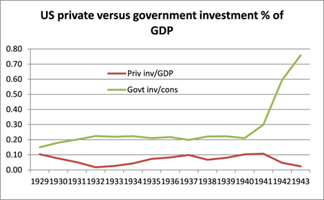 Let Keynes sum it up: “It is, it seems, politically impossible for a capitalistic democracy to organize expenditure on the scale necessary to make the grand experiments which would prove my case — except in war conditions,” from The New Republic (quoted from P. Renshaw, Journal of Contemporary History 1999 vol. 34 (3) p. 377 -364).