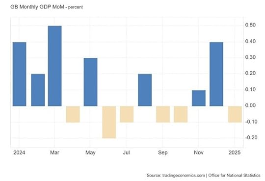 The UK economy remains in stagnation. Real GDP contracted 0.1% month-over-month in January 2025, worse than market expectations of a 0.1% gain. The largest downward contribution came from the production sector which fell 0.9%. The services sector also slowed to just a 0.1% rise.