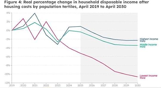 Middle- and higher-income households would have a fall in real disposable incomes of around 3% between 2025 and 2030, with real net earnings falling at the same time as housing costs rise. For the lowest income families, incomes are falling twice as fast as for the middle and the top, with a 6% fall in real disposable incomes between 2025 and 2030. These lowest income families will be £900 worse off by 2030, compared to today.