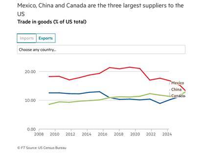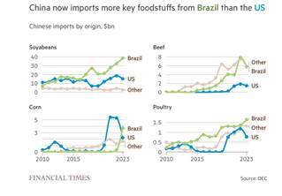 In the current US case, the significant drop in crude oil prices is already putting the profitability of US oil production in jeopardy. American farmers are losing badly in world markets as China switches its food and grain purchases to Brazil. Already, the US share of China’s food imports has collapsed from 20.7 per cent in 2016 to 13.5 per cent in 2023, while Brazil’s grew from 17.2 per cent to 25.2 per cent in the same period. Now Brazil’s beef sales to China climbed a third in the first quarter of 2025, compared with a year earlier while US agricultural shipments to China sank 54 per cent.