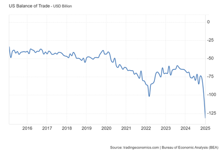 The economic forecasters are lowering their estimates for US economic growth this year. Goldman Sachs has raised the probability of a recession this year to 35% from 20% and now expects US real GDP growth to reach only 1% this year. The Atlanta Fed GDP Now economic forecast for the first quarter of this year (just ended) is for a contraction of 1.4% annualised (ie -0.35% qoq). And Trump’s tariffs are still to come.