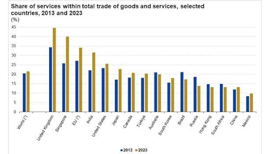 4. Trump’s tariffs are only on goods imports, not services. The US runs a deficit on goods with the European Union countries, so Trump has imposed a 20% tariff on those imports. But there are no measures against services (about 20% of all world trade). The EU runs surplus on goods with the US, but a significant deficit in services (banking, insurance, professional services, software, digital communications etc) with the US. If services had been included, the US deficit with the EU would virtually disappear.