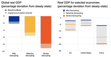 More and more studies argue that a tit-for-tat tariff war will only lead to a reduction in global growth, while pushing up inflation. The latest reckons that with a ‘selective decoupling’ between a (US-centric) West bloc and a (China-centric) East bloc limited to more strategic products, global GDP losses relative to trend growth could hover around 6%. In a more severe scenario affecting all products traded across blocs, losses could climb to 9%. Depending on the scenario, GDP losses could range from 2% to 6% for the US and 2.4% to 9.5% for the EU, while China would face much higher losses.
