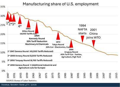 Trump’s aim is clear. He wants to restore America’s manufacturing base within the US. Much of imports into the US from countries like China, Vietnam, Europe, Canada, Mexico etc are from US companies based in those countries selling back to the US at lower cost than if they were based inside America. Over the last 40 years of ‘globalisation’, multi-national companies in the US, Europe, Japan moved their manufacturing operations into the Global South to take advantage of cheap labour, no trade unions or regulations and the use of the latest technology. But what has happened is that countries in Asia have dramatically industrialised their economies as a result and so gained market share in manufacturing and exports, leaving the US to fall back on marketing, finance and services.
