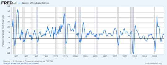 Where is all this going? Well, it means a slump in production in the US and most major economies; and it means a revival of inflation, particularly in the US. This is madness, no? Well, as I said last February when all this kicked off, there is method in this madness. Trump and his accolytes are convinced that the US has been robbed of its economic power and hegemonic status in the world by other major economies stealing their manufacturing base and then imposing all sorts of blockages on the ability of US companies (particularly US manufacturing companies) to rule the roost. For Trump, this is expressed in the overall deficit in the goods trade that the US runs with the rest of the world.