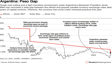 That has not been possible for decades, because of the huge dollar debts owed by the government and the lack of FX reserves to back the peso. Milei has targeted year-end for undoing FX controls, or sooner if the IMF speed up payouts. “The currency controls will no longer exist on January 1 (2026). Maybe sooner,” he said. As a result of the news, the ‘freed up’ official peso rate fell around 9% to 1,170 per US dollar, while, in contrast, the black market rate strengthened, so almost closing the gap between the official and informal rates that had widened sharply in recent years. Despite this, the peso rate against the dollar remains no better than when Milei came to power at the beginning of 2024.