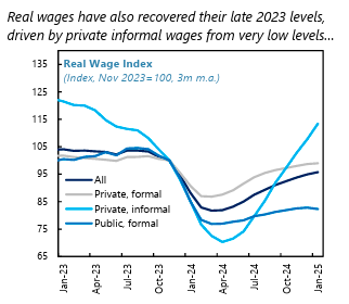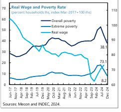 The inflation rate has fallen from 300% a year to around 50% (still high). But that has meant a rise in real wages in the last half of 2024, taking the average back to the end of 2023. But during the whole of 2024, average real wages still fell 12% and public sector workers took a hit of 20% with 30% for informal workers without rights etc. The rise since mid-2024 is entirely due improved incomes for informal workers in the private sector; public sector waged workers are still down 20%, private sector workers are down 5% – and all workers are still worse off than at the beginning of 2023.